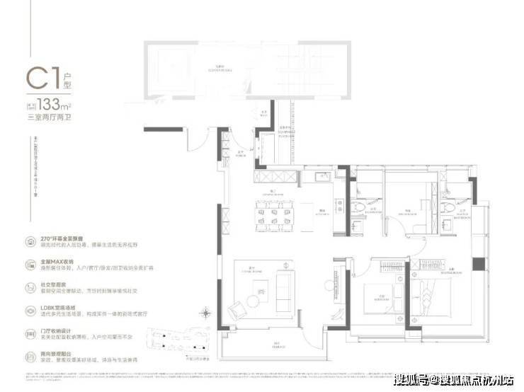 133㎡可以说是108㎡的进阶款,同样的三房两厅两卫,大面宽横厅、半开放式厨房设置岛台,加上主卧L型飘窗,再一次验证了华润置地豪宅化的产品思路。