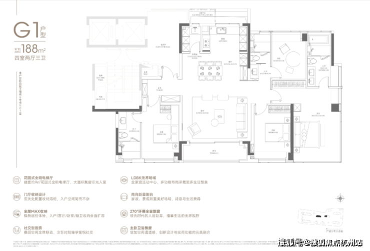 188户型 2梯2户,有独立的电梯厅。4房3卫设计,还是3明卫,这两点还是不错的。