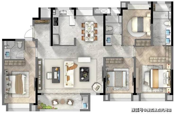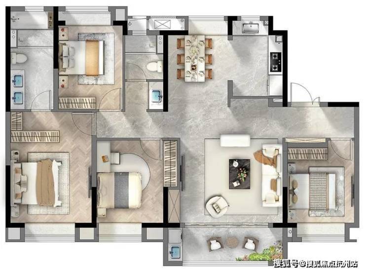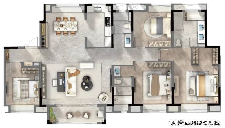 客餐厅厨房一体化外接南向大阳台 ,整个公区视野开阔,尺度非凡,大宅气质呼之欲出!