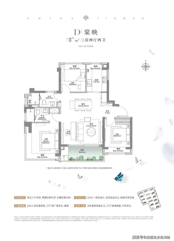 建面约117㎡3房2厅2卫,做到了3开间朝南+5个飘窗+主卧套房设计+270°转角飘窗,居住体验、舒适度、尺度感倍增。