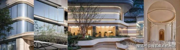 因项目整体抬高,从下沉庭院到架空层“空中花园”的落差极大,形成独特的峡谷地貌,杭序府的设计团队汲取九溪烟树为造园灵感,打造一个立体多维的城市溪谷交互园林;因项目毗邻江岸,杭序府的外立面以“站立的江潮”为灵感,