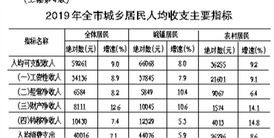 全年全市居民人均可支配收入59261元,增长9.0%,扣除价格因素实际增长5.7%。按常住地分,城镇、农村居民人均可支配收入分别为66068元和36255元,增长8.0%和9.2%,扣除价格因素增长4.8%和5.9%。