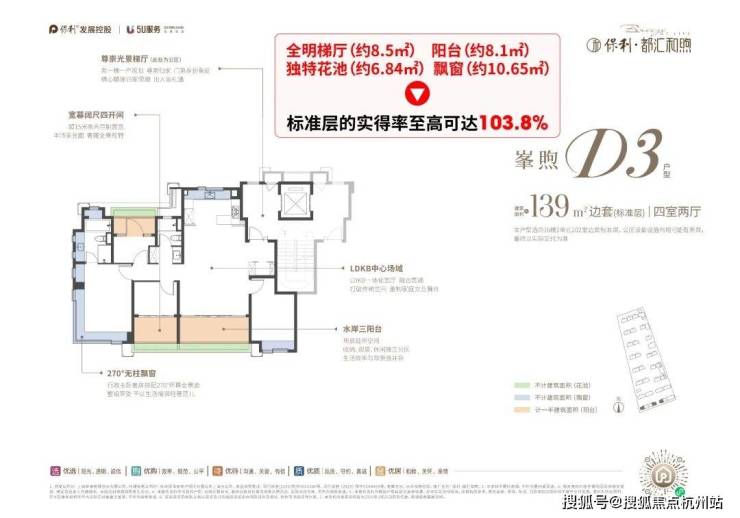 至高约103.8%实得率:项目建面约139㎡户型通过全明梯厅(约8.5㎡)、阳台(约8.1㎡)、独特花池(约6.84㎡)、飘窗(约10.65㎡)等赠送面积,标准层的实得率至高可达103.8%,相当于直接赠送了超200万的空间价值!