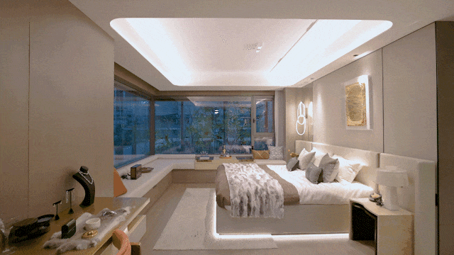 净水方面,配置前置净水和厨房直饮水机;洁净新风方面,配置新风系统为室内输送清新空气;静音方面,室内墙体采用静音墙体技术,利用隔音棉及隔音毡等材料,维护门窗均采用三玻,减少室外噪音干扰;此外,还采用同层排水系统、静音中央空调,共同打造更静谧、舒适的居住空间。