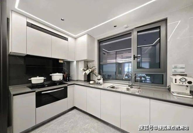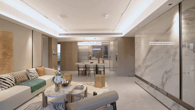 像空调新风地暖“豪宅三大件”齐备,比如中央空调甄选东芝品牌;厨具方面,采用方太的蒸烤一体机、空调油烟机,内嵌冰箱甄选卡萨帝品牌;客厅岩板背景墙也是交付标准;