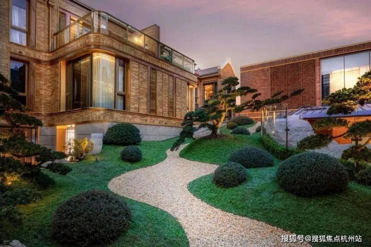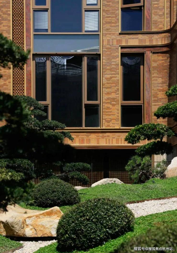 用昂贵的幻彩红奢石,把砖墙的直角做成了更优雅更昂贵的弧线圆角,与红砖形成了更丰富的肌理变化。精心镶嵌的金属线条,勾勒出了建筑的璀璨轮廓。入口处的弧形转角大幅落地玻璃窗,带来高奢酒店的氛围。站在街边,你已经可以看到庭院中的巍巍劲松探出一角,引发你步行归庭的情绪。