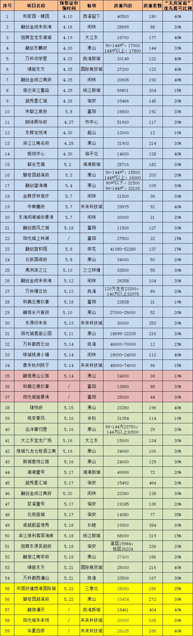 杭州摇号楼盘汇总表(截止2018.5.23)