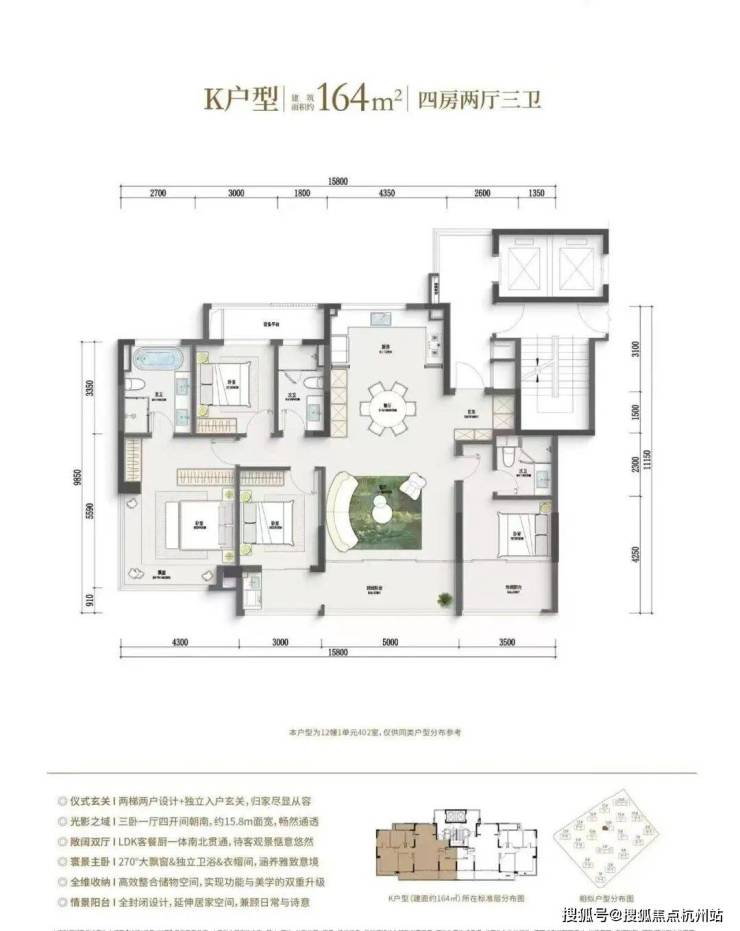 164㎡:四房两厅三卫,270° 转角阳台,改善型大平层体验。