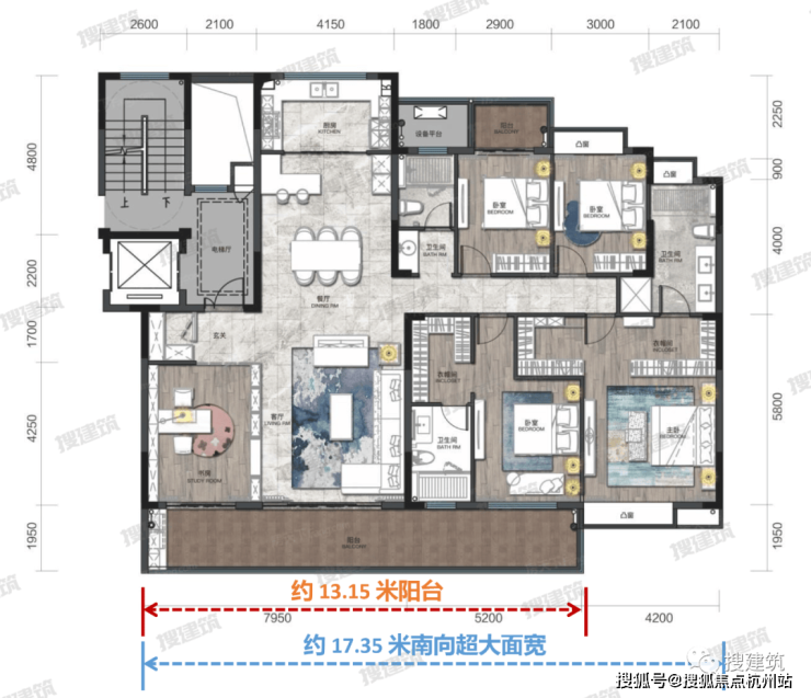 建面约215㎡5房2厅3卫设计,独立的入户电梯厅,双入户玄关设计,整体面宽达17.35米,南向阳台长度约13.15米,南北通透全明户型。