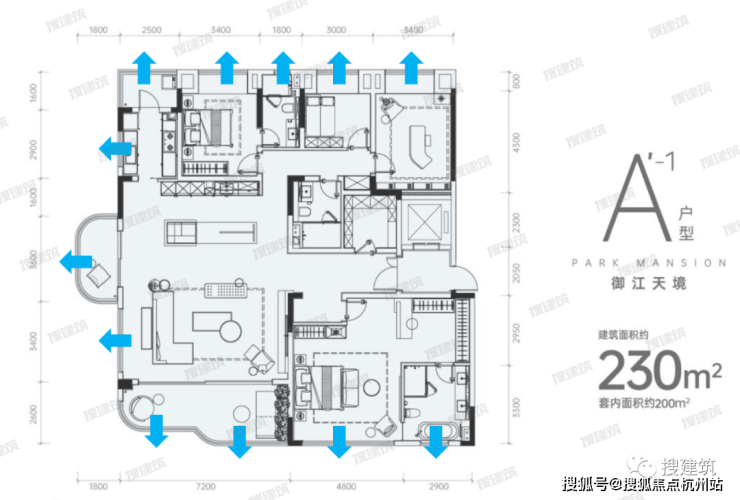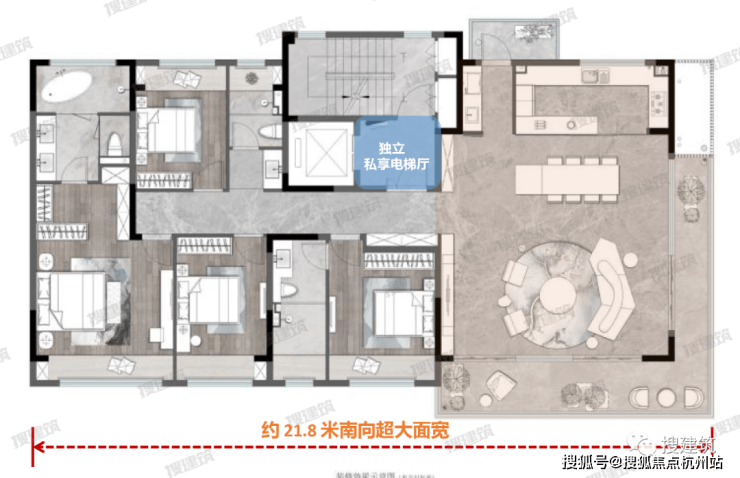南向面宽约20米,大横厅有约8.1米的超大尺度,能实现真正的南北对流,通风采光一流。