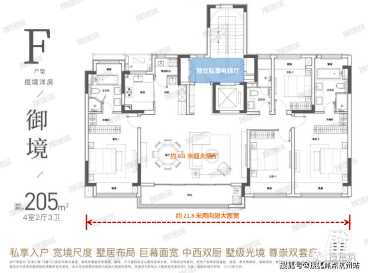 比如建面约272㎡同样为边厅户型,4+1房2厅4卫,预留了保姆间空间。三套间设计,多孩家庭也能从容不迫;约48㎡的主卧套间可定制超大衣帽间或功能区,拥有双观景飘窗;尤其是约22.3米超长L型阳台设计,观景瞰江,大气从容。