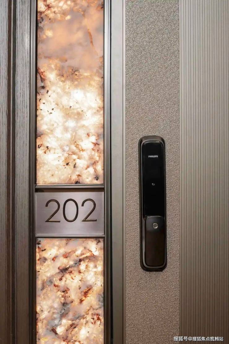入户门一侧以奢石背景板,内嵌灯带,后期门牌号也会内置灯带,让入户门前更加明亮美观,增强归家的幸福感。