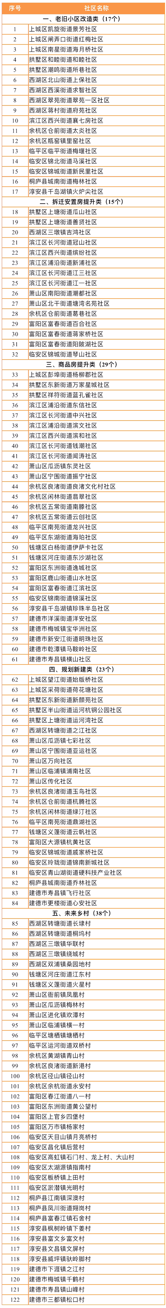 2021年度杭州市未来社区创建名单,共计122个社区,其中老旧小区改造类17个、拆迁安置房提升类15个、商品房提升类29个、以轨道交通TOD为主的规划新建类23个、未来乡村38个。