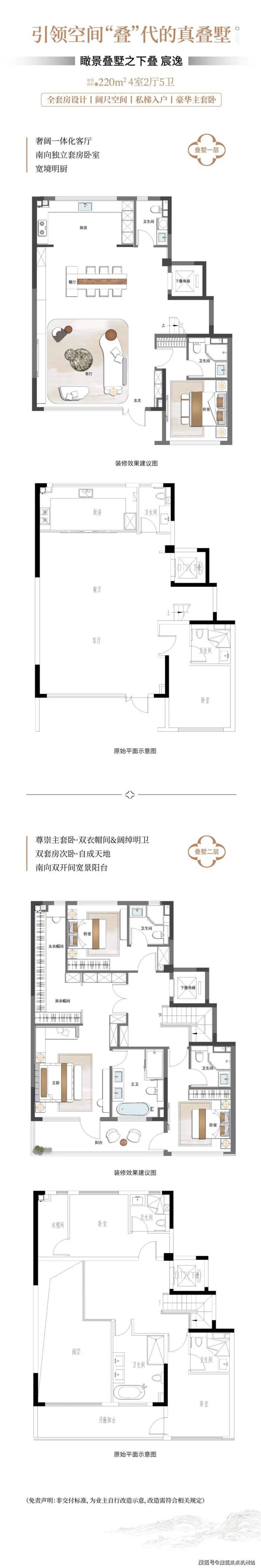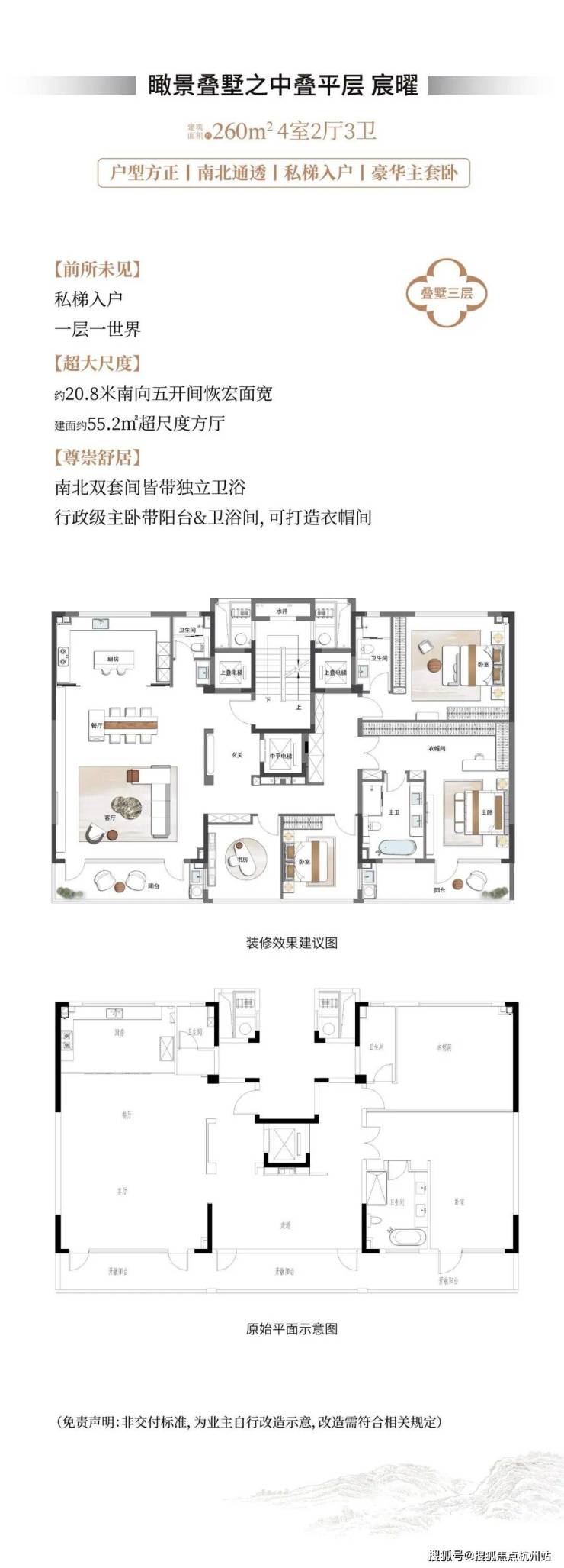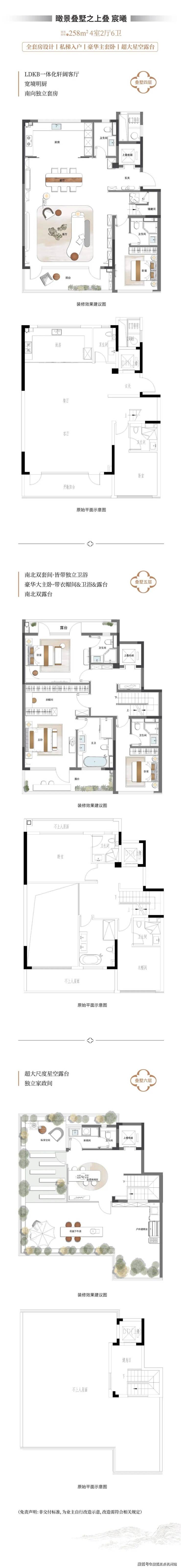 叠墅:建面220-260㎡,下叠私梯入户,中叠平层得房率85%,顶层设延展露台