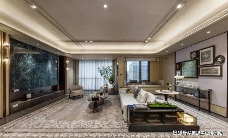 在装饰细节上,从天花板的曲面吊顶、墙体的圆角过渡,到定制家具的流畅线条,都在诉说喜曲不喜平的优雅,天花吊顶,更有刻槽工艺,融入项目logo,赋予业主独一份的尊崇。