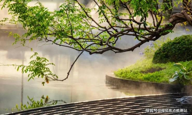 浮光池院水院会客厅,现已实景呈现,水景中央的艺术小品,如一滴水在湖面晕开,泛起阵阵涟漪。