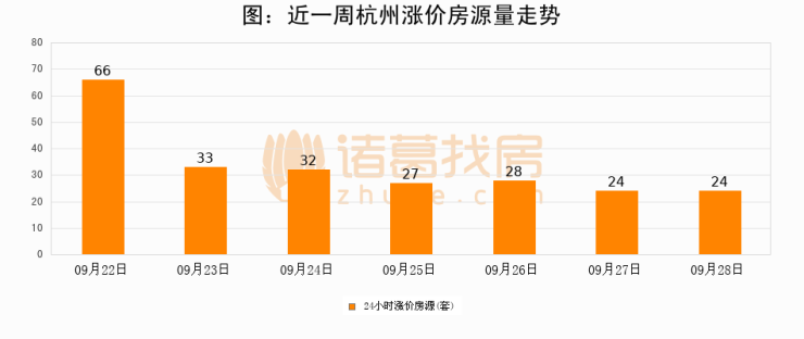 根据诸葛找房数据显示,杭州24小时涨价房源量为24套,较09月27日持平。