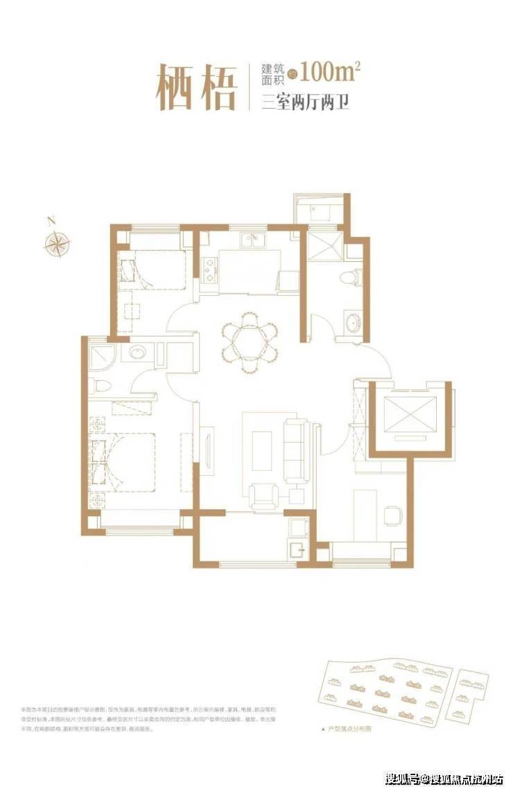建面约100㎡户型3室2厅2卫▼
