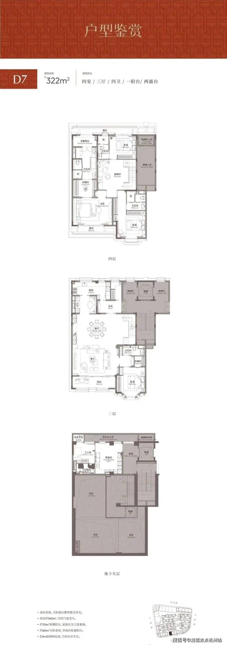 户型:建面约 209-907㎡,覆盖平墅、洋房、叠加、合院,四开间朝南、全景落地窗、跑道阳台,双梯双入户、主佣动线分离、独立保姆套房,全明通透、尺度奢阔