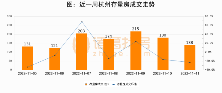 从存量房来看,2022年11月11日杭州存量房单日成交138套,比昨日减少42套,环比下降23.3%。从近一周存量房成交来看,杭州存量房日均成交套数为166套,其中11月09日成交量最高为215套,11月11日单日成交138套,低于近一周平均水平16.9%。