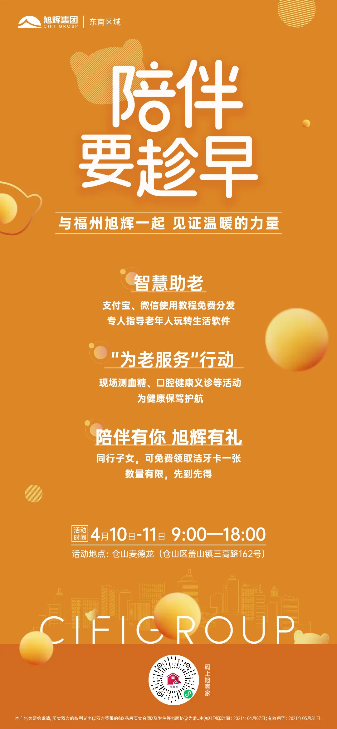 福州旭辉【陪伴要趁早】活动将于4月10日-11日9:00-18:00在仓山麦德龙开启。带着尊老、敬老、爱老、助老的初衷,为前来参加活动的老年朋友们带去关爱与温暖。