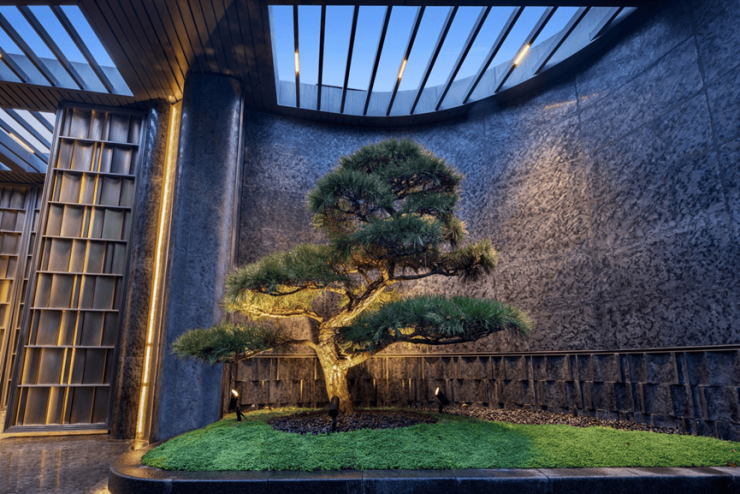 为了给业主一个完美的归家仪式感,项目设计了长约35m宽,约5.1m高奢阔门头,且有名贵黑松迎客。酒店式入户大堂的营造,精选雪山飞狐奢石,高山流水奢石、星白奢石等奢材。