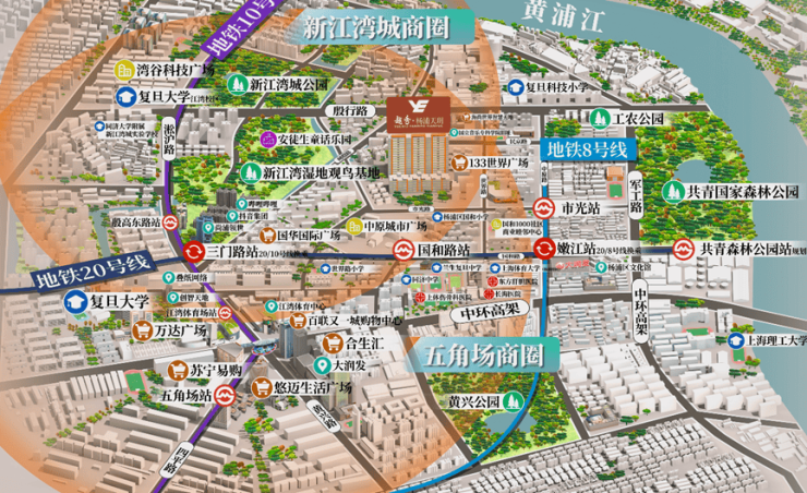 直线距离约800米就是8号线市光路站、还有20号线(规划)国和路站和10号线三门路站,串联起五角场、虹口足球场、静安、人民广场、新天地、淮海路等核心商圈。
