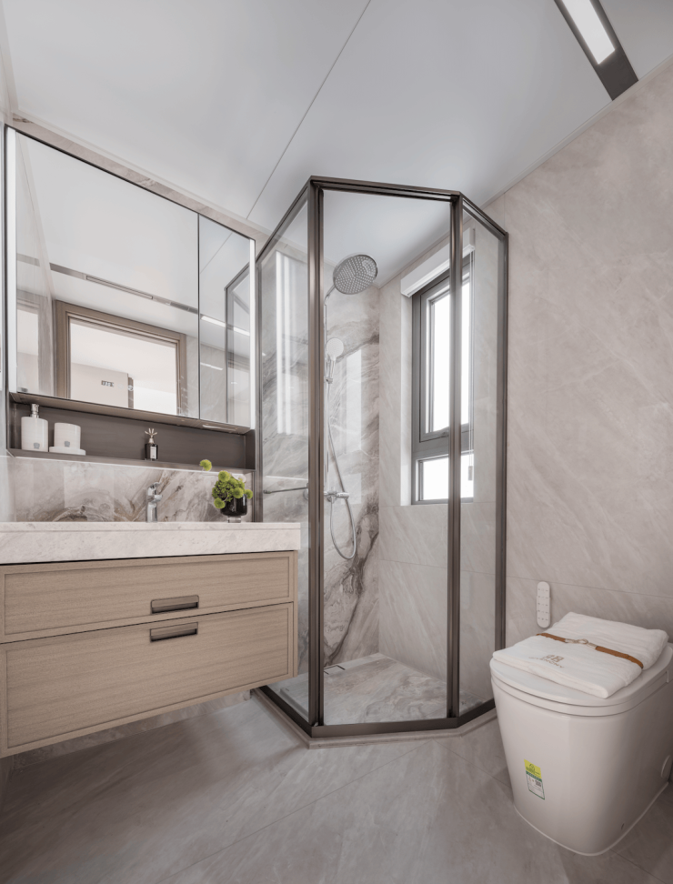 主卧套房式设计,约3.2m的主卧面宽,包括独立的卫浴和飘窗,演绎宽裕尺度。主卫中含大牌恒温花洒、洁具,魔镜内含美妆冰箱:高清镜面,恒温冷藏。