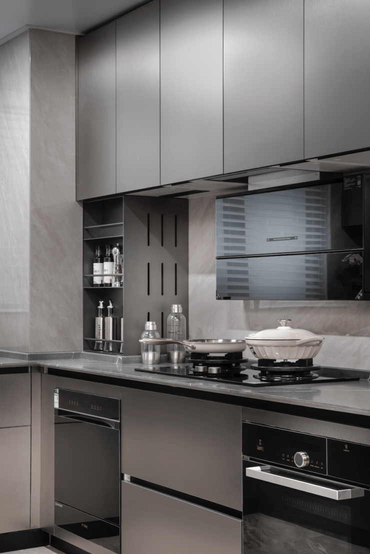 厨房采用 U 字型设计,石英石台面,比人造石台面更耐热、耐压。同时标配厨房七件套包括(油烟机/灶台/洗碗机/蒸烤一体机/冰箱等),还有末端净水器和凉霸。