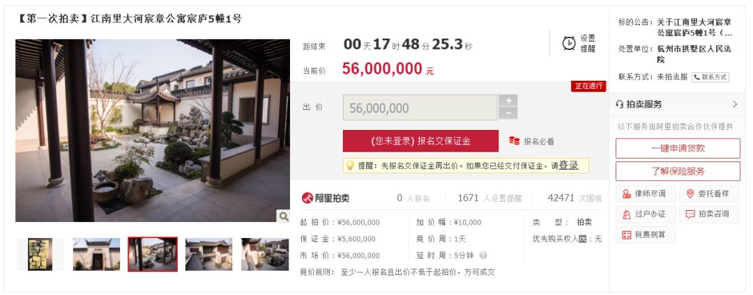 今天早上10点开始,江南里5幢1号房源正式开拍,起步价5600万元。截止发稿,依然是0人报名,不过有1664人设置提醒,有41479次围观。