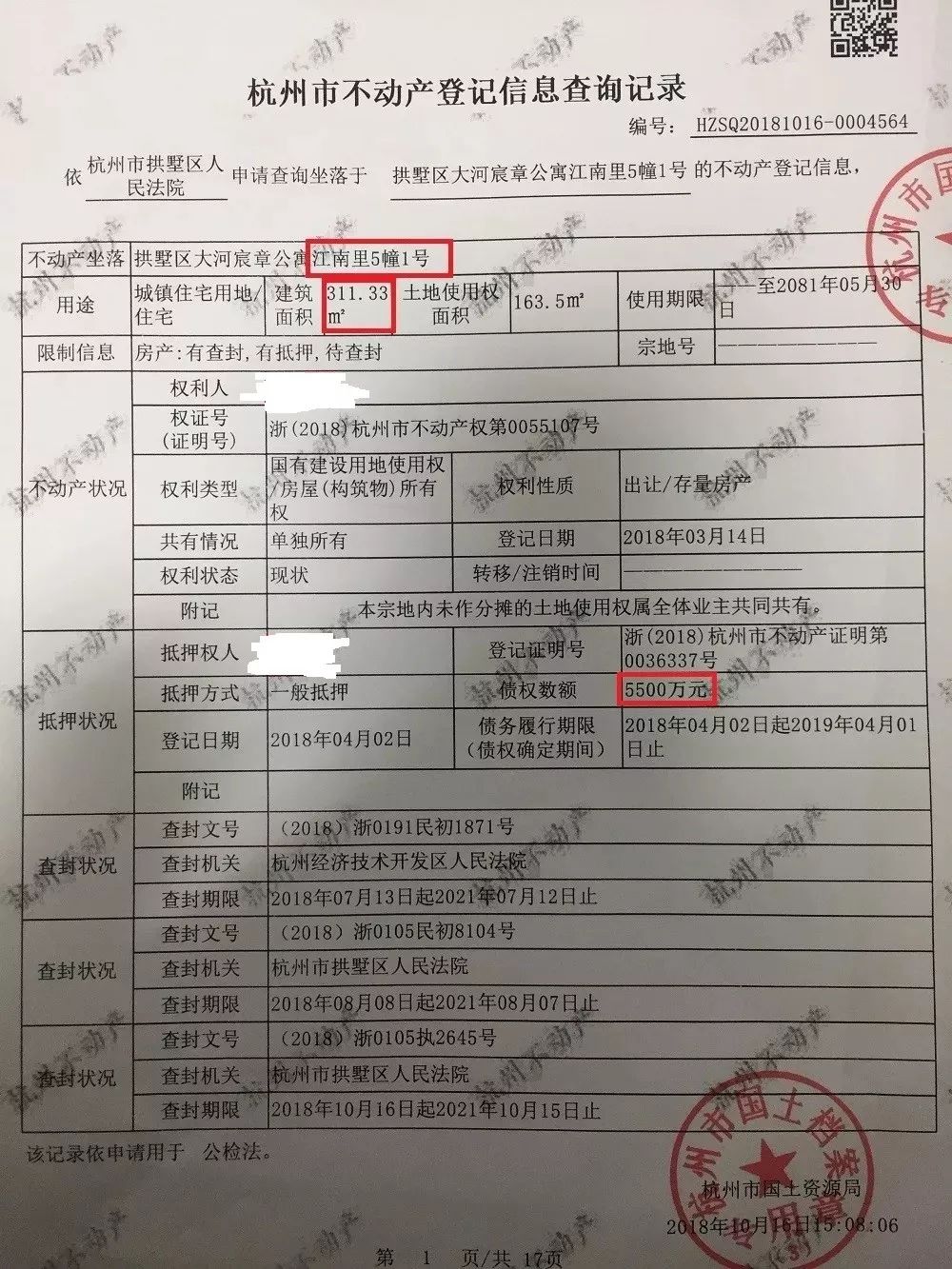 2018年4月,潘女士将江南里的这套房子进行了抵押,债权数额为5500万元。3个月后,该房源被杭州经开区人民法院和拱墅区人民法院查封。