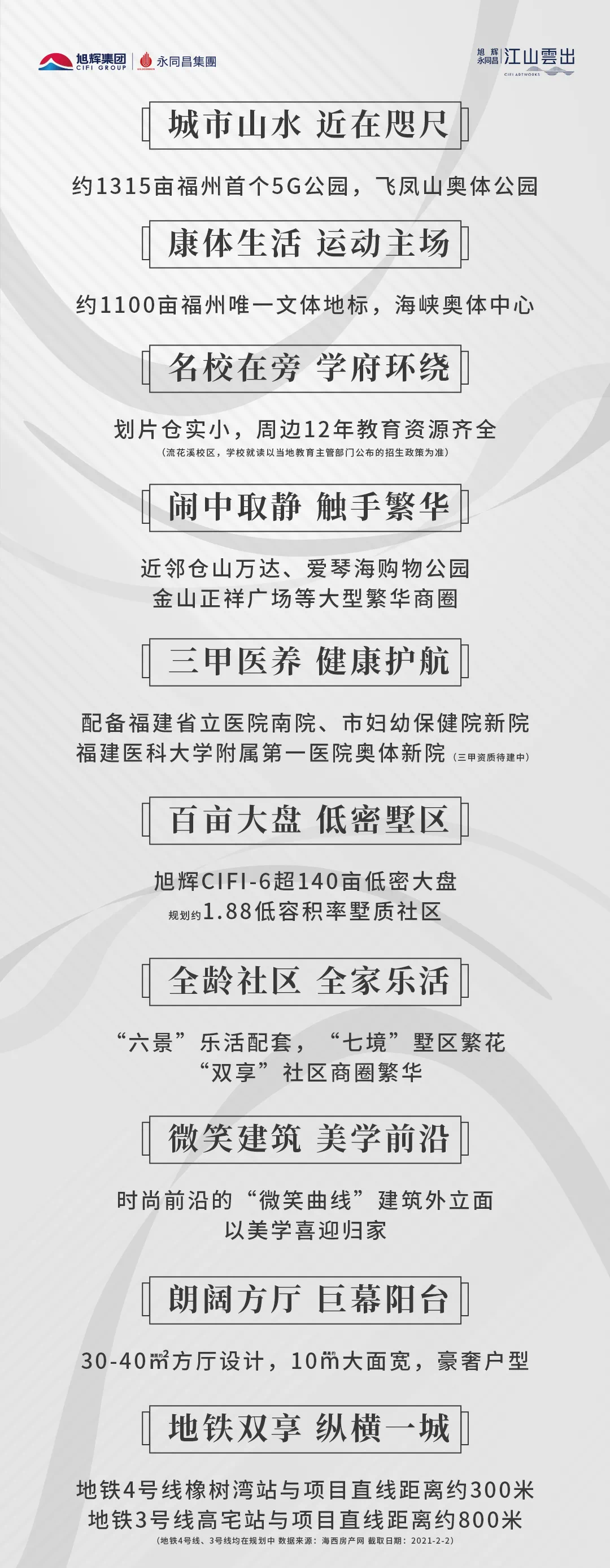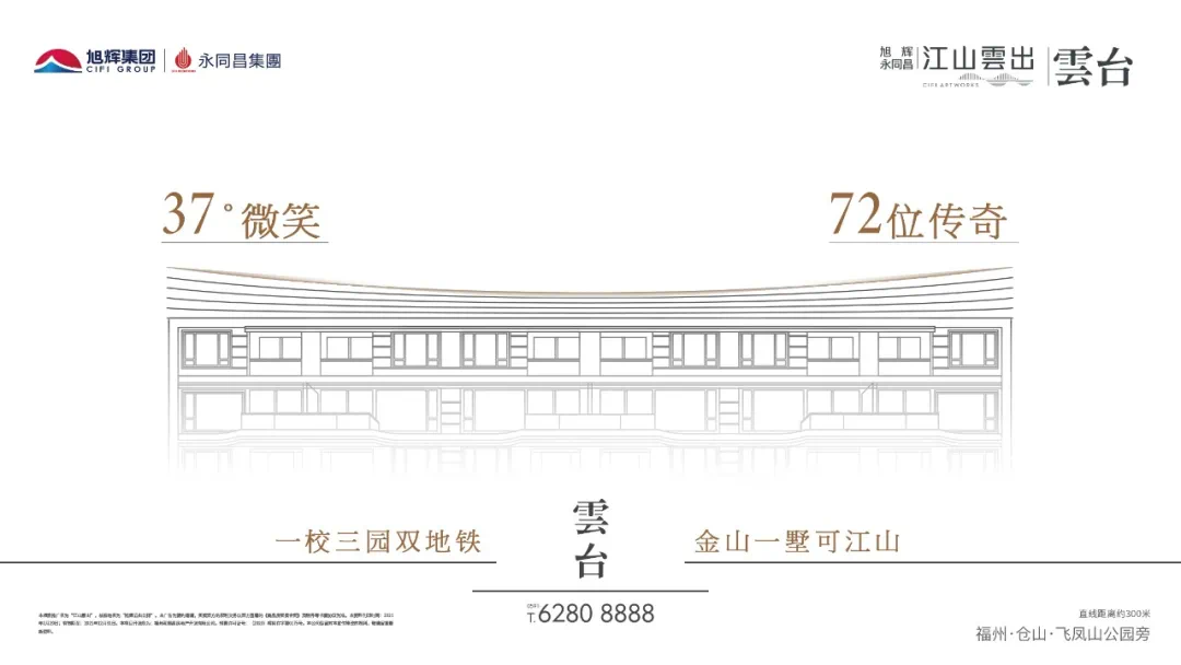 【免责声明】1.本项目推广名为“江山雲出”,核准地名为“旭辉云出公馆”。本广告为要约邀请,买卖双方的权利义务以双方签署的《商品房买卖合同》及附件等书面协议为准。本资料刊印时间:2021年6月13日;有效期至:2021年12月31日。本项目开发商为:福州和极昌房地产开发有限公司,预售许可证号:(2020)榕房许字第0175号。本公司保留对本宣传修改的权利,敬请留意较新资料。2.本页中对项目周边环境、交通、教育及其它配套设施的介绍,旨在提供相关信息,不意味着本公司对此作出了承诺。文章中区位图仅展示项目与周边环境的位置关系,所示地理位置仅供参考,不反映实际情况。各部分之间的距离,受模型大小、材质、表现方式限制,各部分的比例不完全一致,与实际地图存在一定差异。区位图中项目周围自然环境、交通及其他公共设施、市政服务机构、教育及医疗等公共服务机构的介绍,旨在提供相关信息,且并不完整表达周边相关所有信息,实际情况以现状、政府规划及招生政策为准,购房前敬请前往实地观看,实际了解距离关系及周边建筑物现况,或者就项目周边规划咨询相关政府主管部门。区位图中所展示的项目周边状况,不作为出卖人的承诺。
