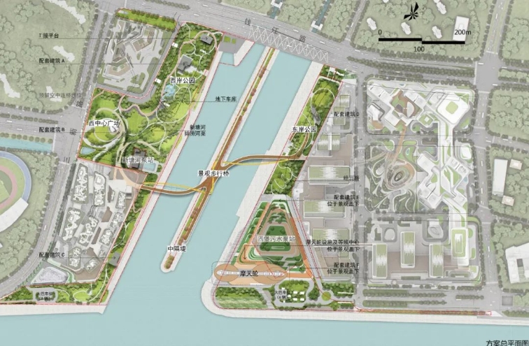 汇中项目建设内容包括摩天轮、两岸公园、配套用房、地下停车库、景观步行桥、经三路、新塘河排涝河渠、新塘河泵站美化、四堡污水泵站改造(上盖)等工程。