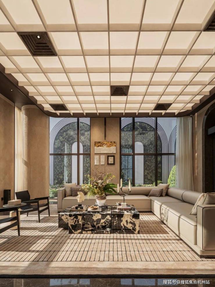 这是杭州市中心首个全抬板的豪宅,项目通过-1层、M层(地面层)、G层(抬升地面层)做了三级立体抬升,把首层住户最高抬升至约12米的高度。
