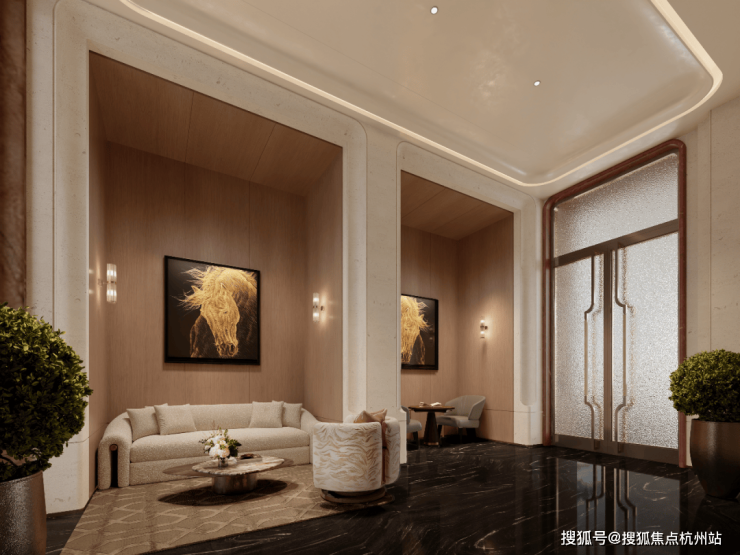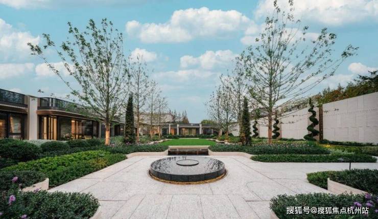 南侧风貌庭院式归家门庭,风貌建筑与精心雕琢的硬质景观和梧桐浓荫相互映衬,以大气庄重的迎宾礼序,彰显归家的仪式感。