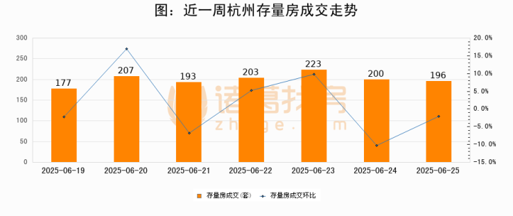 从存量房来看,2025年06月25日杭州存量房单日成交196套,比昨日减少4套,环比下降2%。从近一周存量房成交来看,杭州存量房日均成交套数为199套,06月25日单日成交196套,低于近一周平均水平1.5%。