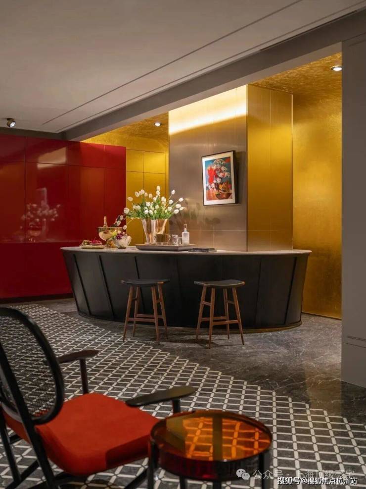 在“木屋”后方,是一个墙面和天花板都覆盖金箔的“水吧”。在这里,我们重新引入了一些当代西方设计语言——大理石地面图案、蛋形吧台和墙面护板细节。这些元素与醒目的红色高光烤漆柜相互平衡。