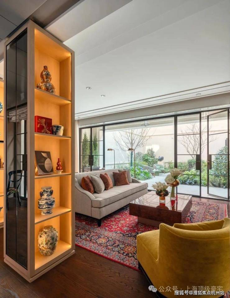 在客厅中,两个展示架巧妙地将空间分隔成主客厅区和休闲室,营造出一个与建筑尺度交相辉映的层次空间。
