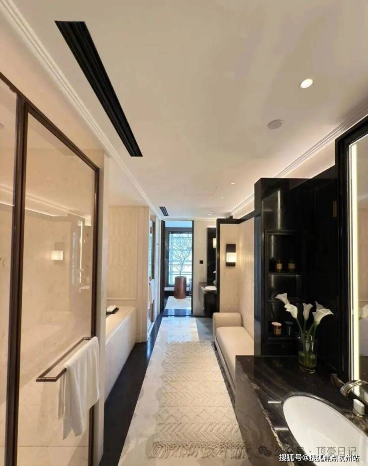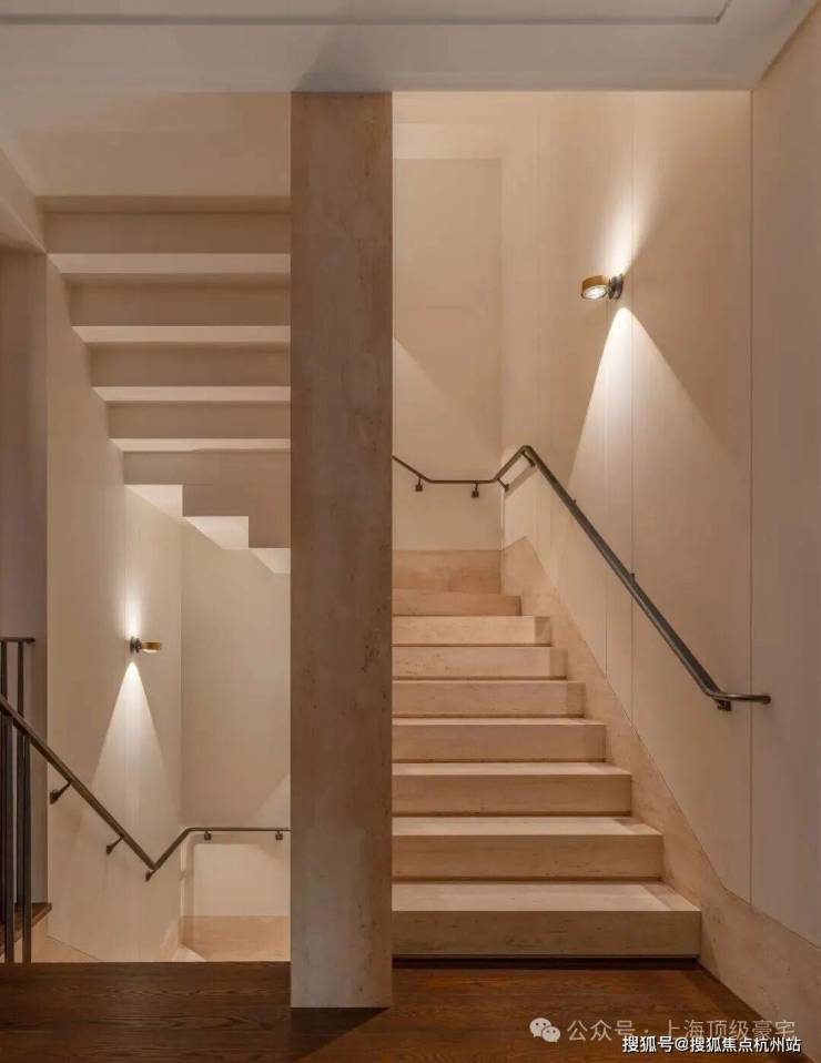 深铜色的栏杆和扶手融合传统与现代语汇,演变出一种当代型态,与现代白色洞石相映成趣,营造出优雅纯粹的意境。
