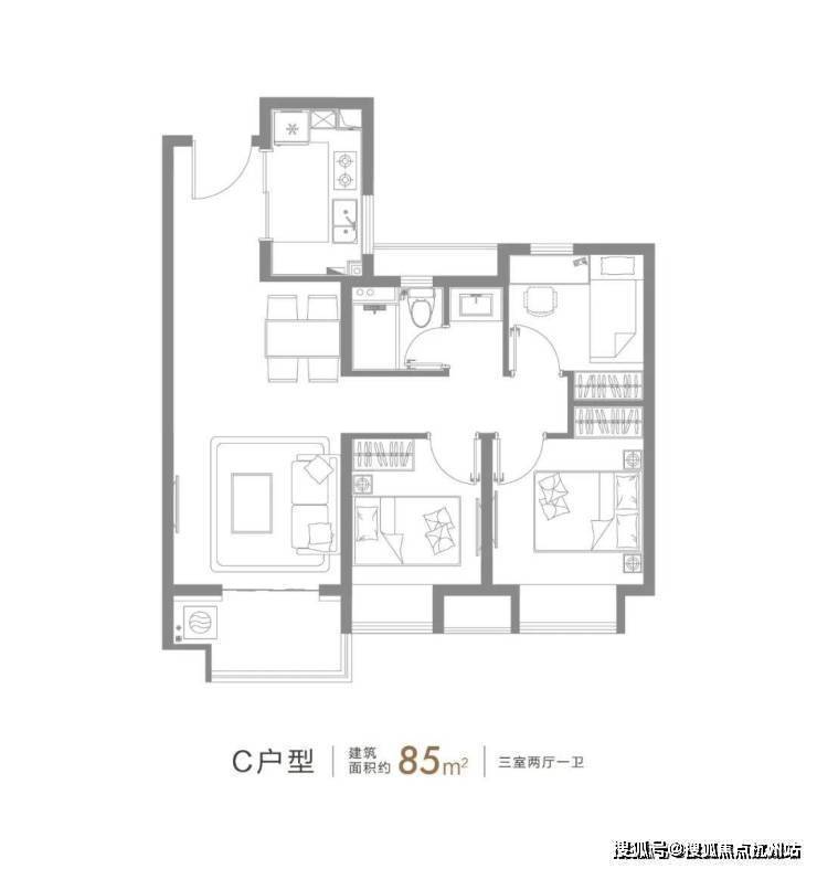 约85㎡的3房2厅1卫,三开间朝南+整体动静分离的设计,都保证了这个户型的居住舒适度。