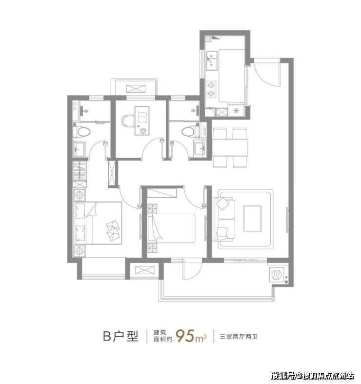约95㎡的3房2厅2卫户型,这个户型的实用性太高了。能保证业主从二人世界到二胎家庭的全生命周期需求。