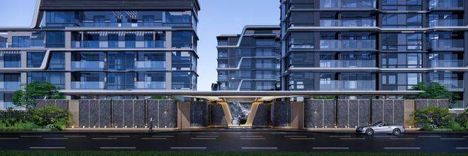 奢阔的社区入口,搭配蓝翡翠镜面奢石 , ✅✅翎翠滨江售楼处电话:400-8385-958✅✅ 为业主带来双重归家礼仪的同时,也为杨浦滨江增添了一处绝美的网红打卡地。