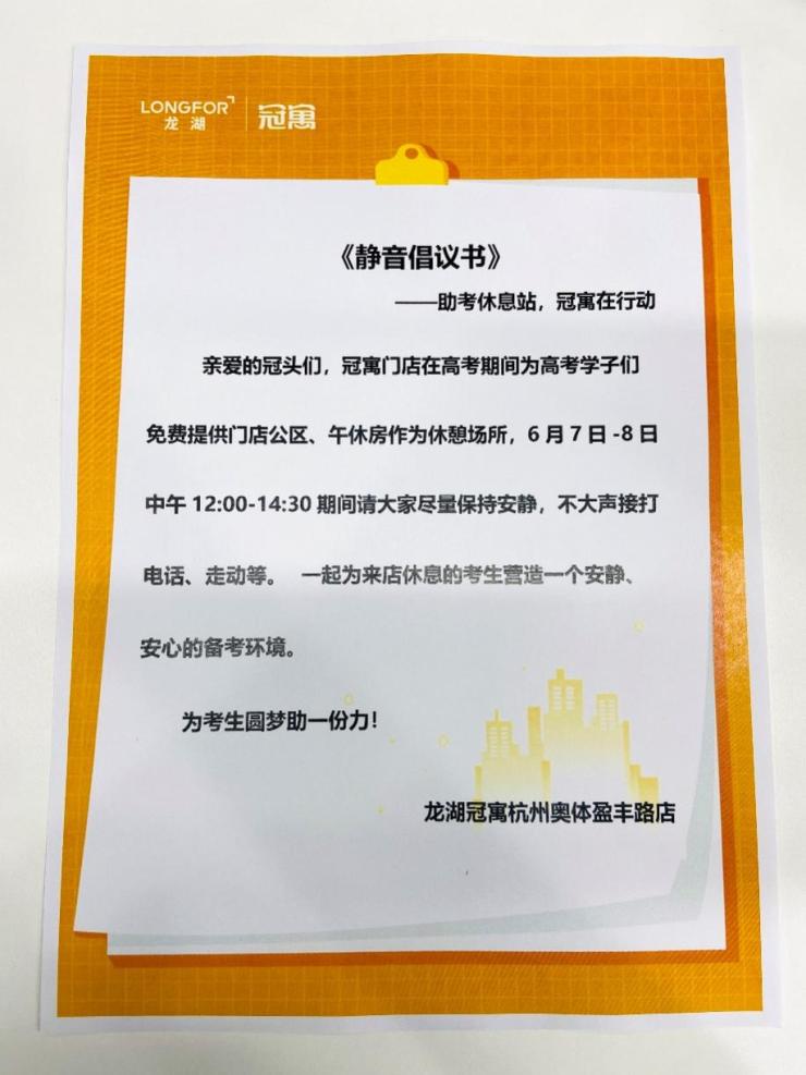 值得注意的是,冠寓在每个门店都公示了一张“静音倡议书”。门店运营官解释道:“这是全国冠寓门店统一的服务动作,除我们自己的工作人员严格遵守外,还会通过线上线下的方式向门店租户发起倡议——高考期间尽量保持安静,不大声接打电话、走动等,帮来店休息的考生营造一个安静、安心的备考环境,为考生圆梦助一份力。”