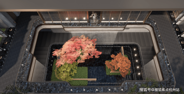 项目利用下沉式景观庭院,结合艺术花园、摩登水景等,打造了一座高端的下沉式会所,规划设有泳池、健身房、行政酒廊等场景。
