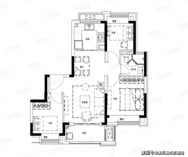 该户型是典型的飞机户型,更称得上最佳户型,整体空间方正,功能丰富;三个房间分布在三个角落,隐私性强;厨房餐厅客厅阳台一体化设计,空间通透;三开间朝南,更多向阳面;U型厨房,利用效率更高;双卫设计,迎合家庭成长需要。