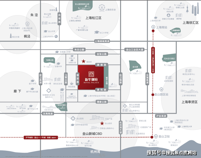 从上图可以看出,今年重磅出台的大虹桥战略,在南向拓展带上,上海对接杭州湾的正是金山。