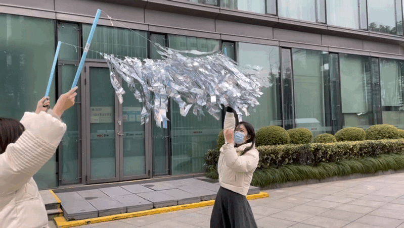 售楼处门前的旭小熊IP“载舟而渔”的主题装置,是以9万条全息镭射膜形成空中飘网的装饰艺术。为了达到随风自然飘起的效果,景观设计师汤逸冰和卢红在前期选材打样时用心推敲镭射纸尺寸及重量、编制密度及风力影响。