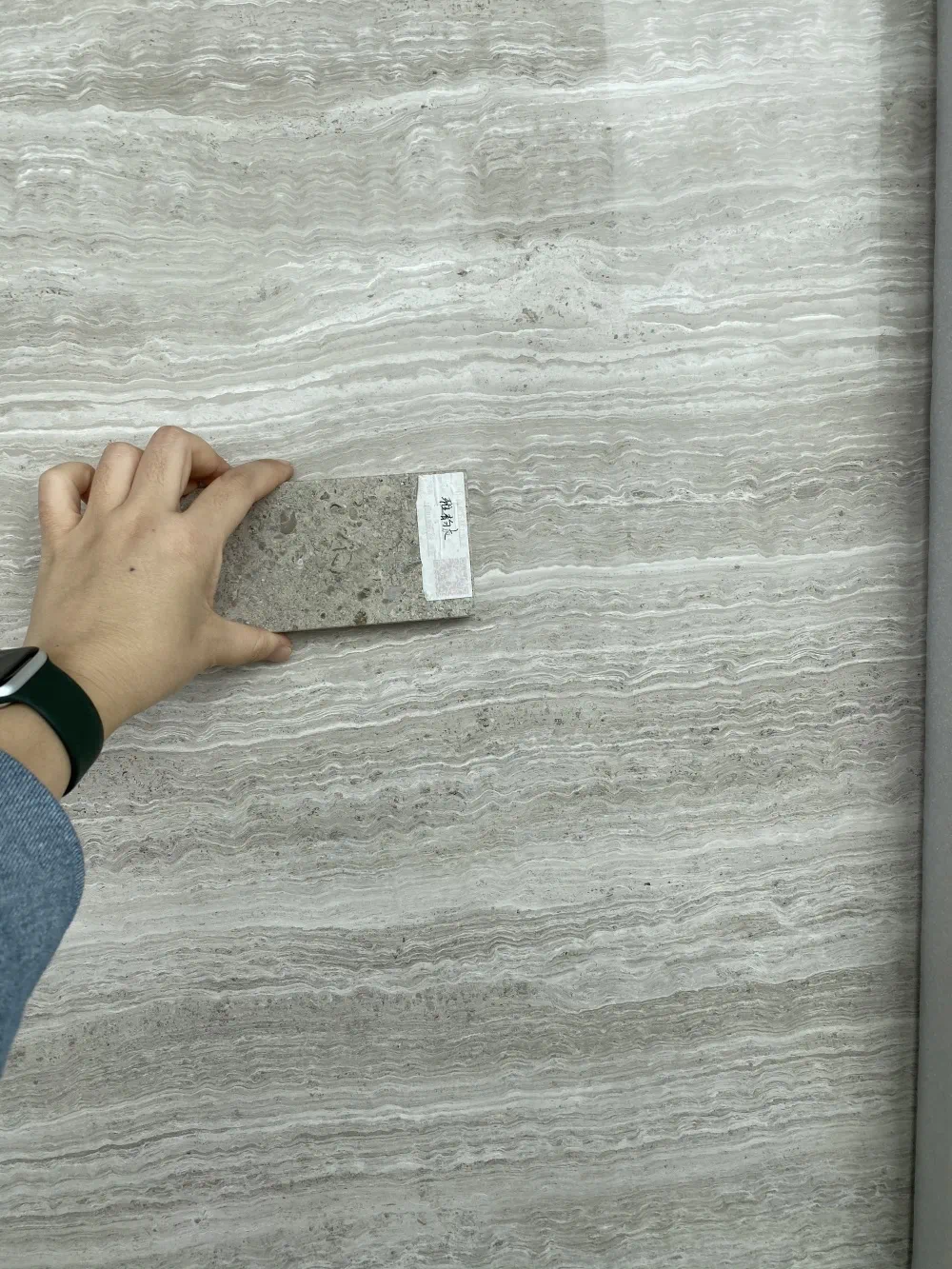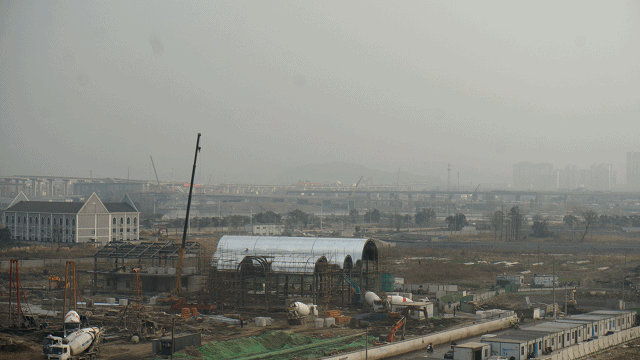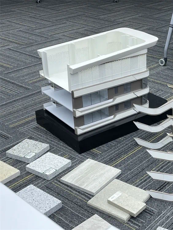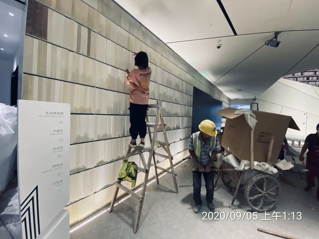 材料是一大难关:为彰显示范区的尊贵气质,实现最优的呈现效果,幕墙、景观和室内主材采用的铝板和大理石选料十分严格:每一块材料的色调需要冷中点暖,而上百块色样中很难100%匹配。为了解决这个难题,设计负责人单挺君带领团队在铝板厂,亲自参与铝板颜色调漆,在刺鼻的油漆味里完成了多次调试和打样,最终实现了理想效果的香槟银铝板颜色。责建许东磊则走遍水头的每个角落,一块一块比对小样和大板,从色感到肌理,丝毫不妥协,最终从上万款大理石中挑选出了适合的材料。