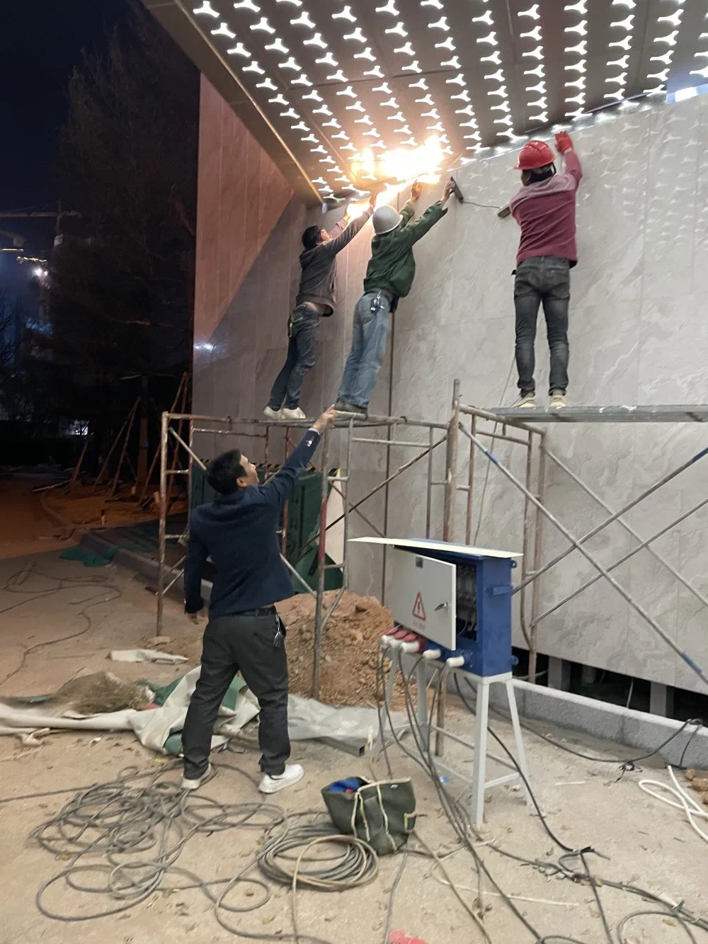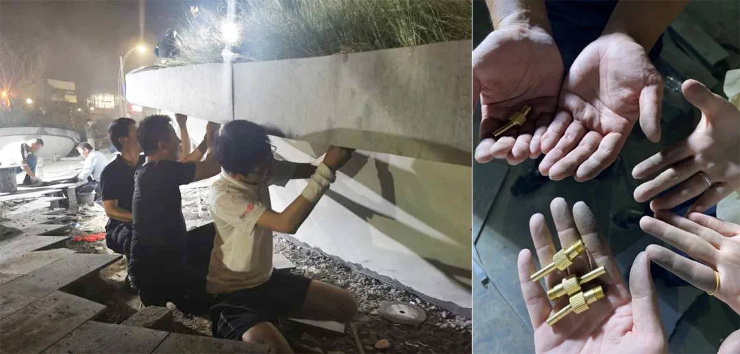 ▲大门灯光调试时,景观工程师吴先梁指辉工人到最后亲自爬上架子指导,力求效果呈现优质