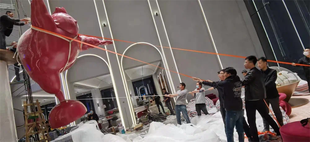 为契合大乌篷艺术中心的主题格调,设计师在售楼处水吧区中庭设置了180公斤的巨型装置艺术——肥胖的蒙拉丽莎系列作品。施工过程全体人员齐上阵,最终呈现一个自由、开放和充满戏剧感的人生态度。